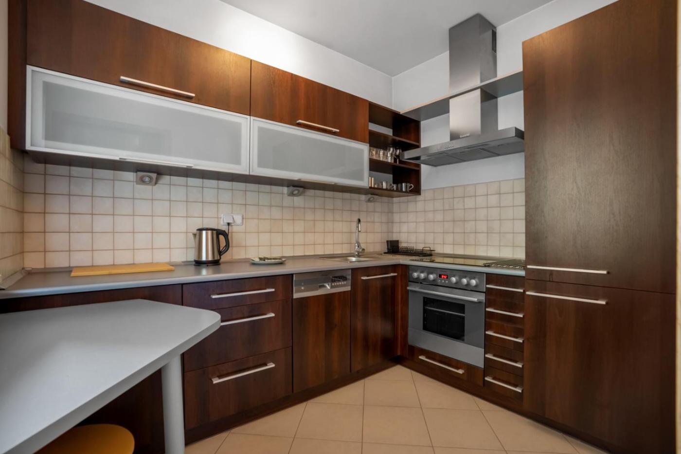 Studio. Guests can make meals in the kitchen that comes with a stovetop, a refrigerator, a dishwasher and kitchenware. The studio provides a washing machine, a private entrance, a balcony with a quiet street view as well as a private bathroom featuring a bath. The unit offers 1 bed. Studio - 2 osobowy. Powierzchnia pokoju ok.: 37 mkw.