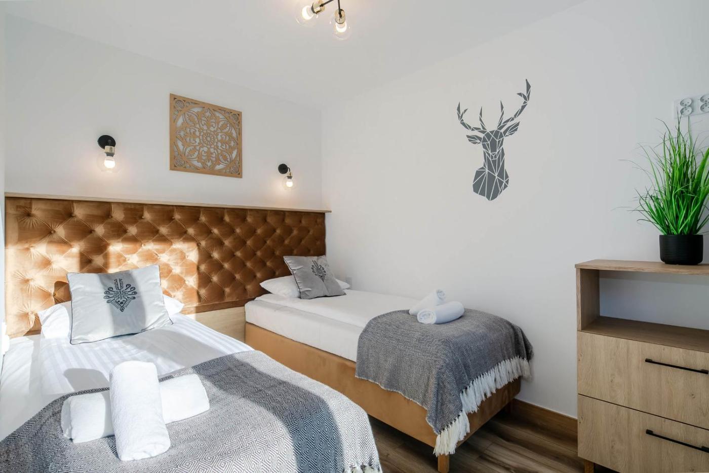 Apartament z 2 sypialniami. This air-conditioned apartment includes 1 living room, 2 separate bedrooms and 1 bathroom with a shower. Guests can make meals in the kitchenette that is fitted with a stovetop, a refrigerator, a dishwasher and kitchenware. Boasting a balcony with garden views, this apartment also offers a coffee machine and a flat-screen TV. The unit has 4 beds. Apartament - 6 osobowy. Powierzchnia pokoju ok.: 50 mkw. ;